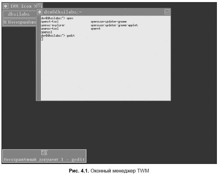 Оконный менеджер TWM (рис. 4.1) настолько неудобен, что вы не станете работать в нем постоянно, даже если у вас очень слабый компьютер. TWM имеет смысл запускать при удаленных сеансах администрирования, особенно, если используется медленное соединение.