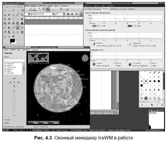 Более удобным является оконный менеджер IceWM (рис. 4.2) — вот его и можно порекомендовать в случае с очень слабой машиной, на которой KDE и GNOME «тормозят». Вам IceWM показался примитивным? Тогда взгляните на рис. 4.3 — это тот же графический менеджер, но с другой темой оформления. Обратите также внимание на системный монитор (в правом верхнем углу экрана), особенно на загрузку процессора и оперативной памяти (всего 206 Мбайт) — и это при запущенном OpenOffice.org, GIMP, Marble! Так что этот оконный менеджер имеет право на существование — не у всех мощные и современные компьютеры, а работать с современным программным обеспечением (последними версиями OpenOffice.org, GIMP и др.) хочется всем.