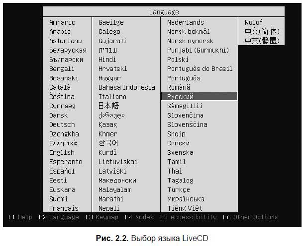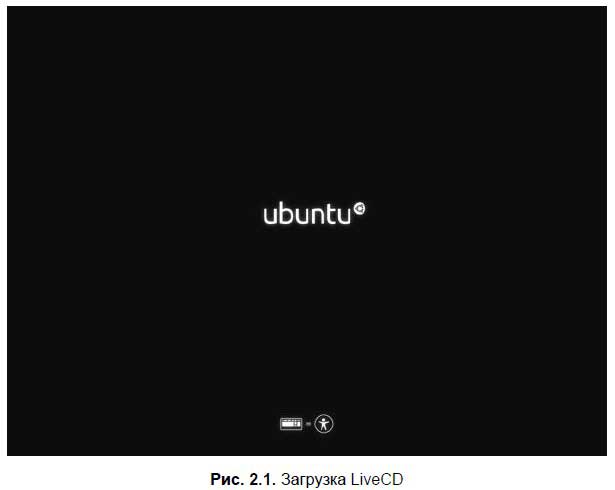 Давайте попробуем поработать с дистрибутивом в режиме LiveCD. Загрузите компьютер с LiveCD — вы увидите графическую заставку Ubuntu (рис. 2.1), нажмите любую клавишу, и вам будет предоставлена возможность для выбора языка (рис. 2.2). Если вы этого не сделаете, через несколько секунд загрузка будет продолжена в обычном режиме, без выбора языка, и откроется меню выбора режима: установка или LiveCD.