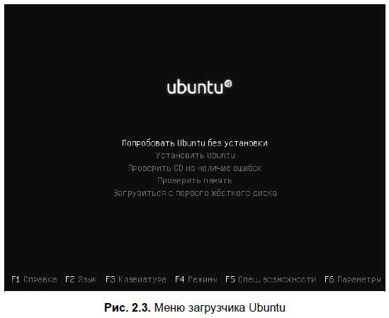 Выбрав русский язык, я увидел меню (рис. 2.3), в котором выбрал опцию Попробовать Ubuntu без установки. Процесс загрузки продолжился, и через некоторое время Ubuntu запустилась. Меня особо порадовала поддержка звуковой платы и автоматическое определение параметров моей видеоподсистемы (видеоадаптера и монитора) — а ведь в некоторых других дистрибутивах пользователям приходится долго мучиться с настройкой звука и видео.