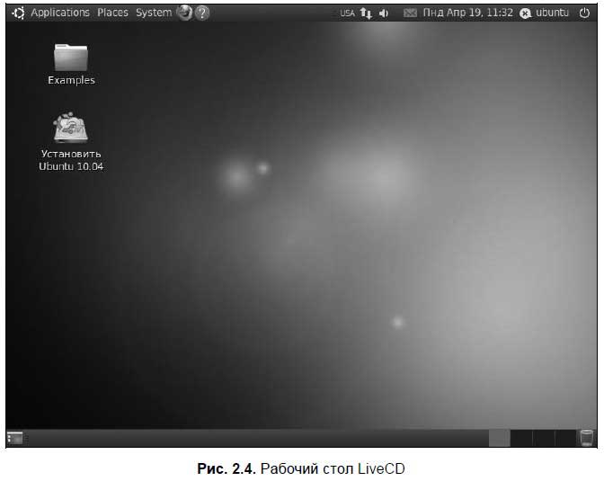 Итак, после запуска вы увидите рабочий стол Ubuntu (рис. 2.4). Напомню, что в дистрибутиве Ununtu (в отличие от Kubuntu) используется графическая среда GNOME, поэтому меню системы будет находиться вверху экрана.