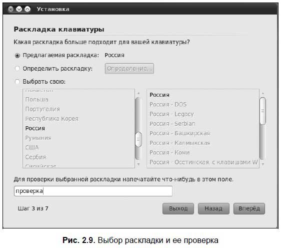 Третий шаг — это выбор раскладки клавиатуры (рис. 2.9). Для проверки раскладки используется поле внизу окна (переключиться на русский язык можно с помощью комбинации клавиш <Alt>+<Shift>).