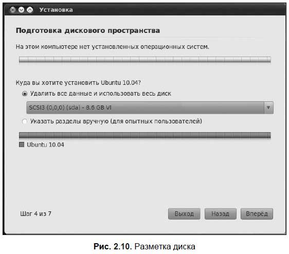Четвертый шаг самый важный — разметка жесткого диска. Будьте очень внимательны, потому что одно неосторожное с вашей стороны действие, и вы можете потерять все имеющиеся на жестком диске данные. Чтобы этого не произошло, внимательно читайте предложения программы установки (рис. 2.10).