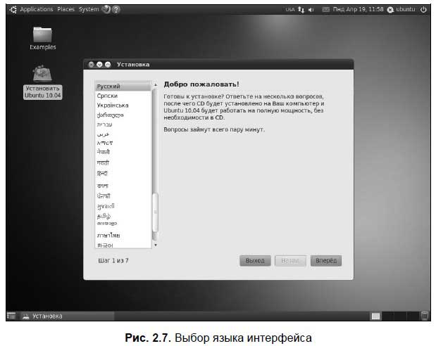 Вот теперь можно приступить к установке операционной системы на жесткий диск компьютера. Даже если при запуске LiveCD вы не выбрали русский язык, программа установки перейдет на русский, как только вы выберете русский язык на первом шаге установки (рис. 2.7). Сразу скажу, что перед запуском инсталлятора Ubuntu я настроил соединение с Интернетом (см. главы 7 и 8).