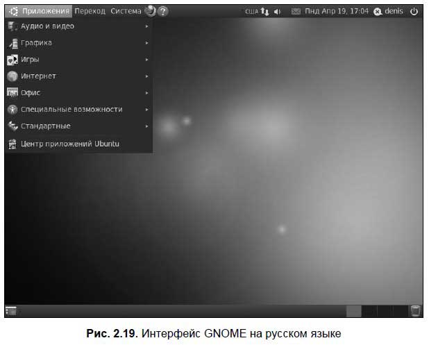В меню Приложения (Applications) содержатся команды запуска установленных приложений (на рис. 2.19 раскрыто), меню Переход (Places) содержит команды перехода в различные места файловой системы: в домашний каталог, к сменным устройствам, в разделы Windows и т. д. Меню Система (System) содержит команды вызова конфигураторов, изменяющих параметры только текущего пользователя — группа Параметры (Preferences) или параметры всей системы — группа Администрирование (Administration). О настройке системы мы поговорим в главе 3.