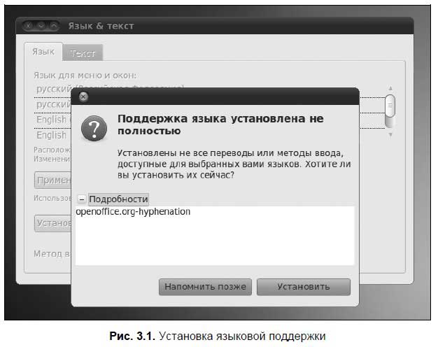 Конфигуратор языковой поддержки сразу же предложит вам устано — вить языковые пакеты. Кстати, при установке системы инсталлятор загружает не все пакеты. В частности, в моем случае не был установлен пакет openoffice.org-hyphenation (рис. 3.1). Конфигуратор «вычислил» этот факт и предложил доустановить отсутствующий пакет. Аналогичным образом, если в вашей системе не будет хватать других пакетов, конфигуратор предложит их доустановить.