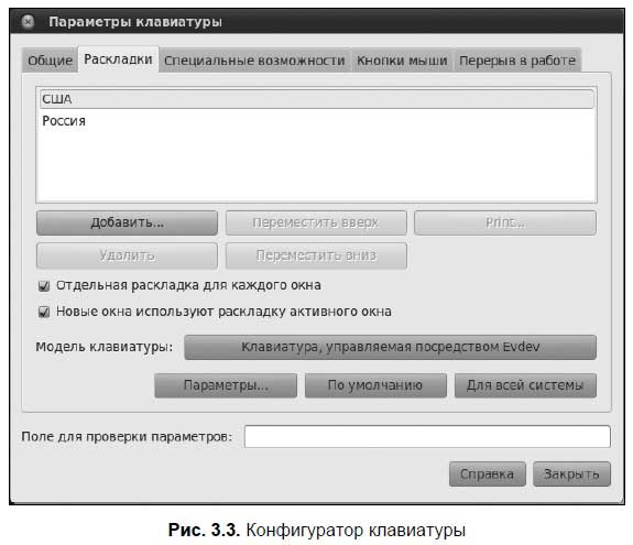 Добавить дополнительную раскладку можно на вкладке Раскладки конфигуратора Система | Параметры | Клавиатура (рис. 3.3). Если вы при установке системы выбрали русский язык, то раскладка для русского языка будет установлена по умолчанию. Чтобы добавить дополнительную раскладку, нажмите кнопку Добавить.