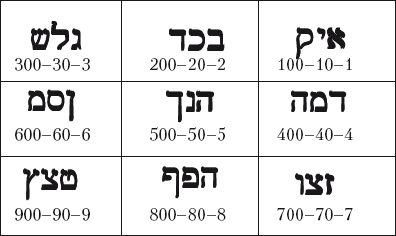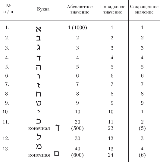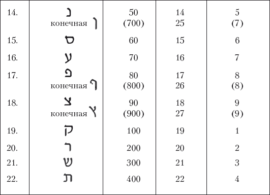 Порядковое значение. В этой системе подсчета буквам просто присваиваются числа от 1 (Алеф) до 22 (Тау). Пять конечных букв выстраиваются после Тав и получают значения от 23 (конечная Каф) до 27 (конечная Цади).