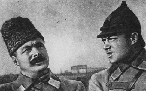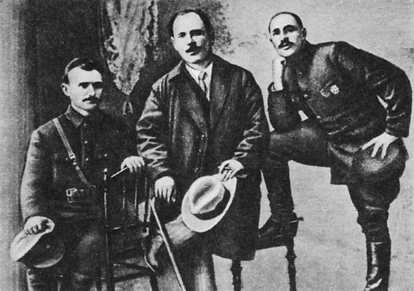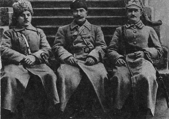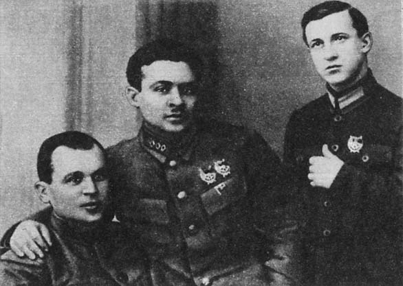 Е. А. Щаденко, Д. Бедный и В. К. Блюхер (слева направо)
