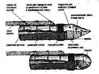 Ракеты Засядко состояли из трех частей: цилиндрической железной гильзы (она набивалась пороховым «ракетным» составом), колпака (наполненного зажигательной смесью в виде пасты) и деревянного хвоста, обеспечивающего устойчивость в полете. В фугасных ракетах вместо зажигательного колпака к гильзе прикреплялась разрывная граната. В ракетном заряде на три четверти длины высверливался канал конической формы, называемый «ракетной пустотой»; оставшуюся часть заряда называли «глухим составом.» Пороховой состав воспламенялся от прикрепленного к нему «стопина» – хлопчатобумажных прядей, пропитанных селитрой и покрытых с помощью клея пороховой мякотью. В свою очередь, стопин зажигали фитилем.