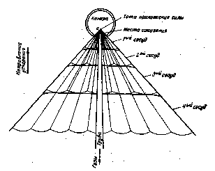 "Снаряд состоит из камеры, где находятся пассажиры и приборы и сосредоточено управление сосудов, где находится активное вещество, и трубы, в которой происходит сгорание и расширение активного вещества и его газов. "Сосуд для активного вещества нужно делать не один, а несколько, потому что такой один сосуд был бы значительного веса и к концу полета, когда почти все активное вещество вышло, составлял бы массу, которая, совершенно не будучи нужной, может быть, в несколько раз утяжеляла бы снаряд и требовала бы большого количества активного вещества и даже могла бы сделать невозможным все предприятие. Поэтому сосудов нужно делать несколько, разных размеров. Вещество расходуется сначала из больших (сосудов), когда они кончаются, то просто выбрасываются, и начинают расходовать из следующего. Размеры сосудов нужно рассчитывать таким образом, чтобы вес кончающегося сосуда (одного сосуда без вещества) составлял для всех сосудов одну и ту же часть веса всей остальной оставшейся ракеты. Какую часть – это нужно выработать, сообразуясь, во-первых, с тем требованием, чтобы эта часть была возможно меньшей; во-вторых, с тем, чтобы число сосудов не было чересчур велико и таким образом не усложнилось бы чересчур устройство снаряда. На чертеже схематически представлена удобнейшая, по-моему, форма снаряда – камера, приблизительно круглая – сосуды в виде слоев конуса (приблизительно подобных). В виде слоев они сделаны для того, чтобы иметь меньшее протяжение по направлению ускорения, чтобы в них не получалось большого давления (высокого столба жидкости). Конус не выгодно делать ни слишком широким, ни слишком длинным – в обоих случаях должна будет увеличиваться прочность сосудов по расчету на ускорение, а в первом – и по расчету на давление (активное вещество – жидкие газы(...)).