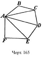 Для примера возьмем ш е с т и у г о л ь н и к (черт. 165). Проведем из какой-нибудь его вершины, напр., из A, диагонали к прочим вершинам. Мы разобьем этим наш шестиугольник на 4 треугольника. Сумма углов каждого из них 180°, а всех четырех вместе-180° 4. Но это и есть, как легко понять, сумма всех углов нашего шестиугольника.