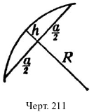 Искомую величину стрелки h можно вычислить из этого квадратного уравнения. Если стрелка, как часто бывает, весьма мала по сравнению с радиусом круга, то членом h2можно пренебречь, и тогда h приближенно равно a2/8R. По этой формуле вычисляют, например, стрелку дуги железнодорожного закругления, радиус которого достигает 1000 метров и больше, стрелка же не превышает нескольких, метров.