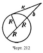 Пусть требуется определить длину касательной к (черт. 212), если радиус круга R, а кратчайшее расстояние от начала касательной до окружности – b. Проведя радиус к точке касания, имеем прямоугольный треугольник, в котором
