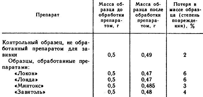 В Центральном научно-исследовательском институте бытового обслуживания были проведены также исследования по определению степени повреждения волос в результате воздействия на них различных препаратов для химической завивки. Степень повреждения волос определялась по следующей методике: 50 мл препаратов для завивки заливали в колбу, подогревали до 50 °С и вносили туда 0,5 г волос. Содержимое колбы хорошо перемешивали и выдерживали в термостате при постоянной температуре 50°С в течение 60 мин. Затем раствор отфильтровывали и нейтрализовали 5%-ным раствором уксусной кислоты, промывали водой и высушивали до постоянной массы при 105°С.