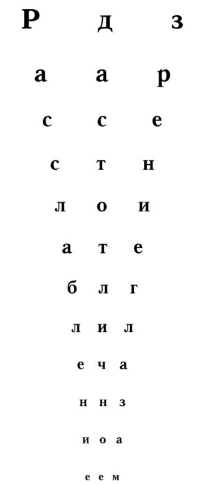 Теперь, зная расположение букв, вы можете смотреть на таблицу без усилия. Сядьте перед таблицей на расстоянии, позволяющем видеть верхнюю строку, но не очень четко. Теперь мягко закройте глаза и вспомните букву «Р». Направьте нос на белую поверхность слева от буквы, затем вправо от нее, и так много раз в быстром темпе. Сделав вдох, откройте глаза и проделайте то же самое. Поскольку смотрение на чистый фон не требует никаких усилий, буква может стать для близорукого глаза более четко видимой. В случае дальнозоркости ее изображение также улучшится.