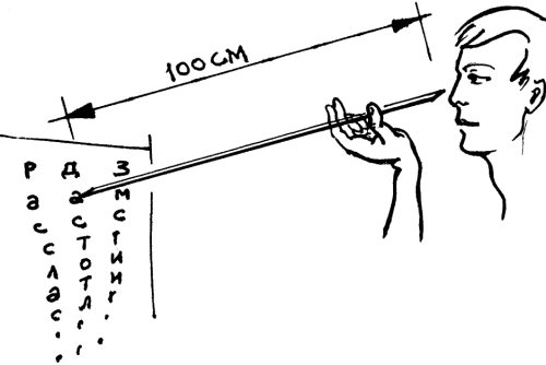 Как и в упражнении 1, расположите таблицу при хорошем освещении и выполните соляризацию, пальминг и упражнения для глазных мышц. Держа один конец линейки длиной 1 м за кромку близко к своему носу, другой конец направьте на верхнюю строку таблицы. Глядя на ближайший конец линейки, быстро моргните. Это положение «Приготовиться».