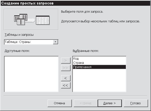 На экране появится окно Создание простых запросов (см. рис. 11.1), где предлагается выбрать поля для запроса из таблицы или другого запроса (таких таблиц или запросов может быть несколько). Выберите таблицу Страны и с помощью знакомой вам кнопки