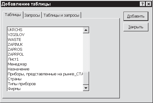 Как и при запуске мастера, откройте конструктор, выбрав вкладку Запросы окна базы данных. Теперь активизируйте опцию Создание запроса в режиме конструктора. После этого вы увидите окно Добавление таблицы. В нем вам нужно выбрать таблицы и/или запросы, на основе которых следует сформировать запрос (см. рис. 11.3).