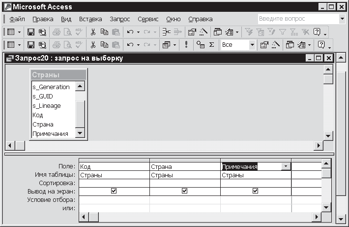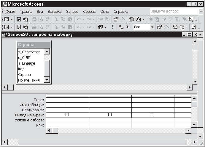 Как мы уже решили, это будет таблица Страны. На экране появится окно конструктора запроса – основного инструмента для построения запроса (см. рис. 11.4). В окне вы видите включенный в него макет таблицы Страны, которую вы только что выбрали. Кроме того, в окне расположены поля репликации (в данном случае они нас не интересуют) и поля таблицы: Код, Страна и Примечание.