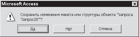 Если вы теперь закроете окно конструктора с помощью обычной кнопки с изображением крестика, то Access 2002 попросит вас подтвердить выполненные операции или внесенные изменения (см. рис. 11.6). Если вы соглашаетесь, система предложит назвать запрос. По умолчанию будет предложено имя Запрос с каким-либо порядковым номером – в нашем случае Запрос20. Затем откроется окно базы данных (см. рис. 11.7).