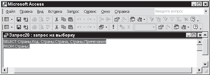 • в меню Вид панели меню Microsoft Access активизировать опцию Режим SQL;