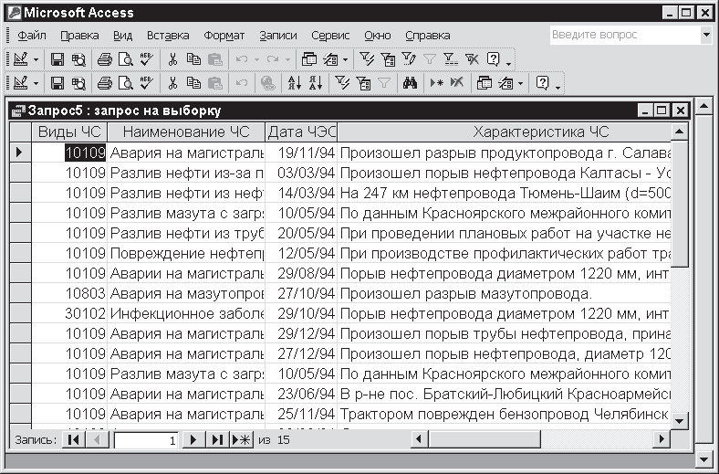 Количество таких строк практически не ограничено, поэтому составной критерий может включать достаточно большое число операндов. Запустив запрос на выполнение, вы получите таблицу (см. рис. 11.22). Обратите внимание, что она похожа на результирующую таблицу, представленную на рис. 11.16, когда вы сформировали запрос с одним критерием. Однако в новой таблице отобрано уже не 8 записей, а 15, и среди аварийных объектов назван, в частности, мазутопровод.