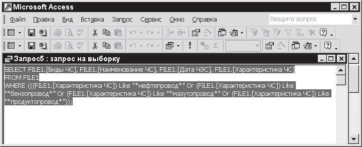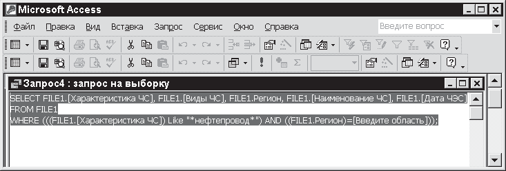 Теперь изучим соответствующую инструкцию SQL (см. рис. 11.20). Как видно из рисунка, введение нового критерия отбора влияет только на предложение с ключевым словом WHERE. К этому предложению добавляется логическое выражение типа AND (И), операндами которого являются "*нефтепровод*" и "Тюменская область". В остальном инструкция SQL остается неизменной.