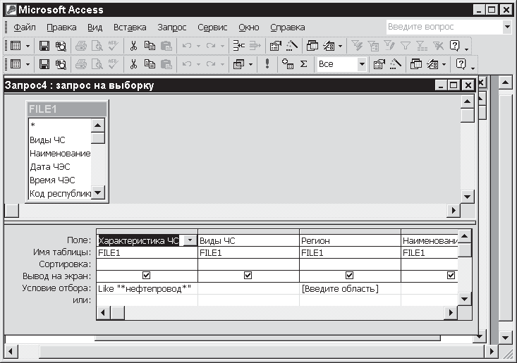 Откройте окно конструктора запроса для таблицы Fiie1. Как и раньше, введите значение первого критерия – «*нефтепровод*» – в строку Условие отбора на ее пересечении со столбцом Характеристика ЧЭС. Следующие значения критериев вводятся в этом же столбце, но в строках, расположенных ниже по вертикали. Каждая из них помечена словом OR (Или) – рис. 11.21.