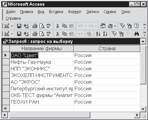 Откройте окно конструктора запроса и введите в него две таблицы: Фирмы и Страны. Как и раньше, вы используете таблицу Добавить таблицу, но теперь по очереди выбираете из нее две или более таблицы (см. рис. 11.3). Вы снова указываете в таблице Фирмы поле Название фирмы, а в таблице Страны – поле Страна; однако в ячейке Условие отбора столбца Страна вводите критерий Россия (см. рис. 11.27).