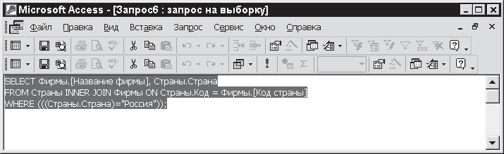 Если вы теперь откроете инструкцию SQL (рис. 11.29), то увидите в ней новый элемент, который указывает на связь между таблицами Фирмы и Страны. Это ключевое слово INNER JOIN. Операция INNER JOIN доступна в любом предложении FROM и позволяет осуществить самое простое связывание – объединить записи двух таблиц, если их связующие поля содержат одинаковые значения. При этом INNER JOIN определяет объединяемые таблицы, а другое ключевое слово ON – объединяемые поля, которые имеют одинаковые значения.