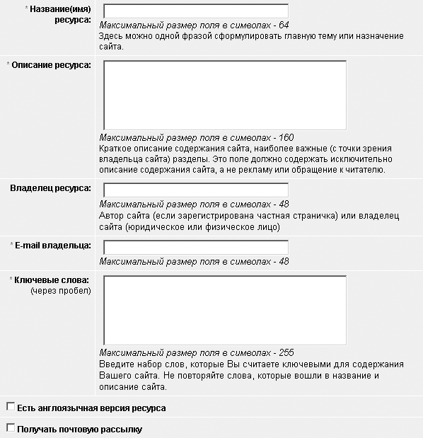 Регистрационная анкета в поисковой системе Rambler находится по адресуЕе заполнение гарантирует, что, по крайней мере, эта анкета будет найдена при соответствующем поиске, и по ссылке с нее пользователь сможет попасть на ваш сайт. Рекомендуется также воспользоваться регистрацией в случае, если ваши страницы располагаются на зарубежных сайтах. Роботы сканируют ресурсы, находящиеся в странах ближнего зарубежья, и игнорируют остальные иностранные сайты.