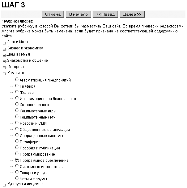 Регистрация в поисковой машине Апорт намного сложнее и выполняется поэтапно. Если заявка, заполняемая на первом этапе, весьма проста (она представлена на рис. 1.3), то в дальнейшем предлагается заполнить довольно объемную форму (рис. 1.4), указать рубрику (рис. 1.5) и т. д.