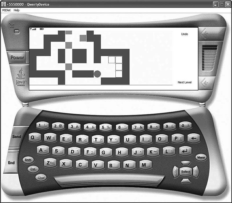 Пример игры Worm – это вариация известной игры Snake, о которой вы узнали в предыдущей главе. Поиграйте немного в игру и поэкспериментируйте с эмулятором. Когда закончите и закроете окно эмулятора, попробуйте другую конфигурацию устройства, которую можно выбрать из выпадающего меню инструмента KToolbar. На рис. 2.9 показана игра PushPuzzle, эмулированная на устройстве с конфигурацией Qwerty.