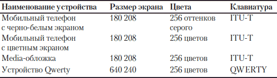 Первые два типа устройств наиболее важны для эмуляции игр на мобильных телефонах, хотя, вероятно, вам понадобится протестировать игры на других типах устройств. В таблице 2.1 приведены характеристики каждого из типов устройств.