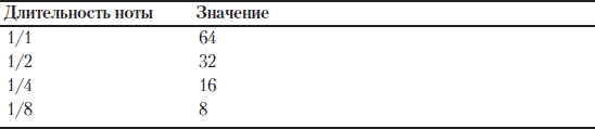 Каждая нота в последовательности определяется парой значений, которые задают высоту и длительность звука. Например, в блоке А нота Е4 имеет длительность 8, что соответствует одной восьмой. В таблице 8.3 приведены значения наиболее часто используемых длительностей.