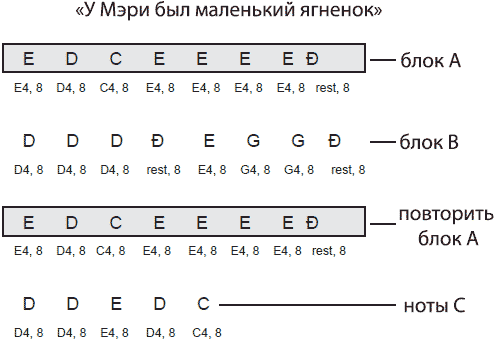 Константа BLOCK_START открывает блок «А». Обозначение «А» ничего особенного не значит, оно просто выделяет фрагмент тональной последовательности. В примере программируется песня «Mary Had a Little Lamb» («У Мэри был маленький ягненок»), а фрагменты нот воспроизводятся в следующем порядке: A-B-A-C. Иначе говоря, блок «А» воспроизводится дважды: один раз в начале, а затем после фрагмента B. Поскольку фрагменты B и C не повторяются, то нет необходимости выделять их в отдельные блоки.