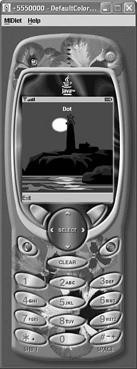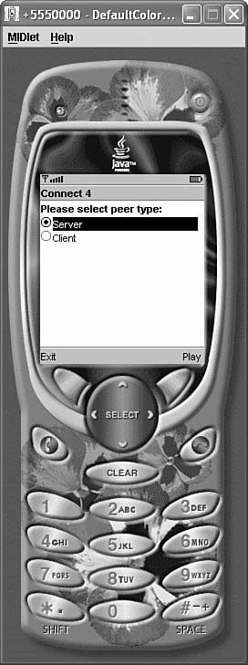 Мидлет Lighthouse – это, вероятно, самое мудреное приложение, которое вы тестировали, поскольку оно требует наличия двух мобильных телефонов, или двух запущенных эмуляторов J2ME. Несмотря на то что я настоятельно рекомендую тестировать приложение на реальных устройствах, J2ME позволяет наглядно протестировать мидлет на двух расположенных рядом виртуальных телефонах. Чтобы протестировать мидлет Lighthouse, запустите два раза эмулятор J2ME. На одном из виртуальных телефонов выберите режим функционирования «сервер», а на другом – «клиент». На рис. 14.1 на виртуальном телефоне выбран режим сервера.