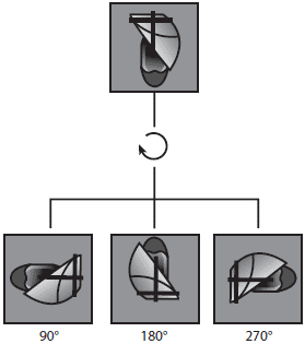 Рассмотрим пример High Seas, созданный в главах 12 и 13. В этой игре спрайт пиратского корабля состоит из четырех фреймов (рис. 17.1), которые содержат изображения корабля, повернутого на север, восток, юг и запад. Эти положения соответствуют поворотам одного спрайтового изображения на 90 0, следовательно, можно избежать применения всех изображений, если использовать возможности класса Sprite (рис. 17.2).