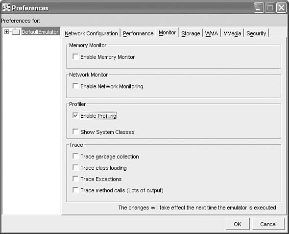 Единственное отличие между окном, представленным на рисунке, и окном на экране вашего компьютера может заключаться в том, что у вас, вероятно, не поставлена галочка в окошке метки Enable Profiling (Включить анализ). Поставьте галочку, чтобы разрешить анализ мидлетов. Когда вы щелкнете по кнопке OK, анализатор Java готов, он запустится в следующий раз, когда вы будете использовать эмулятор J2ME.