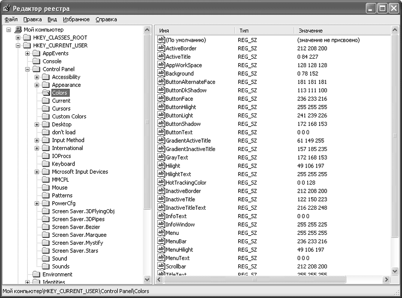 Большая часть компонентов раздела HKEY_CURRENT_USER поддерживается с помощью приложений и панели управления. Тем не менее на практике можно столкнуться с такими ситуациями, когда изменения выполняются вручную, а не с помощью стандартного приложения. Так, в ряде случаев проще задать палитру цветов посредством подобного подхода, поскольку воспроизводимый перечень содержит все возможные варианты (рис. 12.9). Если его просмотреть, можно без труда найти записи (например, кнопки), которые не допускают изменения состояния с помощью опций диалогового окна Дополнительное оформление (Advanced Appearance). Разрешается задавать внешний вид этих кнопок по своему усмотрению.