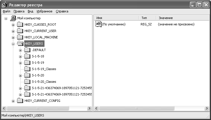 Рисунок 12.11. Windows XP создает в разделе hkey_users по одной записи на каждого пользователя, который регистрируется в системе