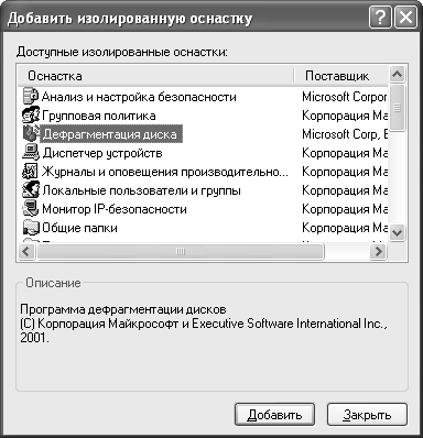 Нажмите кнопку Добавить (Add), появится диалоговое окно Добавить изолированную оснастку (Add Standalone Snap-in), подобное показанному на рис. 7.7. В данном примере я использовал оснастку Дефрагментация диска (Disk Defragmentation). В поле Описание (Description) приводится краткий комментарий для этой оснастки.