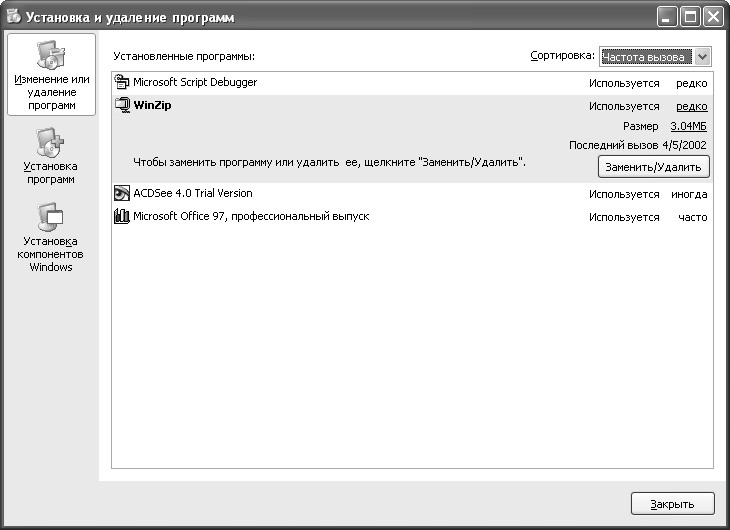 5. Закройте диалоговое окно Мастера компонентов Windows и в диалоговом окне Установка и удаление программ щелкните по кнопке Изменение или удаление программ (Change or Remove Programs). Воспользуйтесь новым оригинальным программным средством – ниспадающим списком Сортировка (Sort by) в правой части окна: выберите, например, вариант сортировки по имени (Sort By ListBox) или по частоте вызова (Frequency of Use) – рис. 8.4.