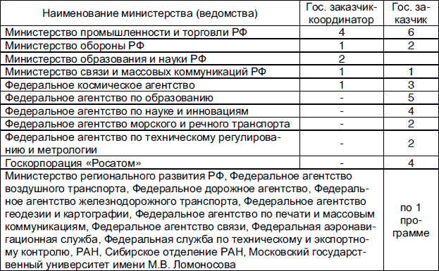 Таблица 2.1. Закрепление ФЦП по направлению «Развитие высоких технологий» за министерствами и ведомствами РФ
