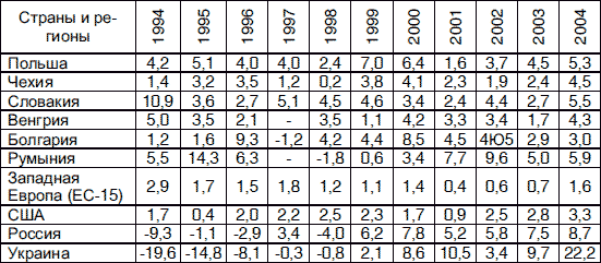 Расчеты показывают, что темпы роста производительности труда в странах ЦВЕ, как правило, превышают аналогичные показатели США и ЕС-15. При этом выделяются такие страны, как Польша и Румыния. Но в последние годы большинство стран ЦВЕ стали отставать по темпам роста производительности труда от России и Украины (табл. 2.2).