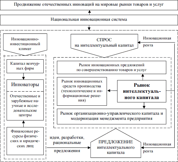 В сложившихся условиях особая роль принадлежит механизмам реализации продуктов интеллектуального труда посредством рынка интеллектуального капитала. Современный рынок интеллектуального капитала имеет сложную структуру, включающую в себя совокупность институтов по разработке, внедрению, защите и продвижению инновационных продуктов как внутри одной страны, так и между странами (рис. 3.3).
