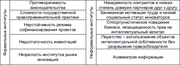 Необходимо признать, что в настоящее время инфраструктура рынка интеллектуального капитала развита недостаточно. Институциональные ограничения для развития рынка интеллектуального капитала показаны в табл. 3.5.