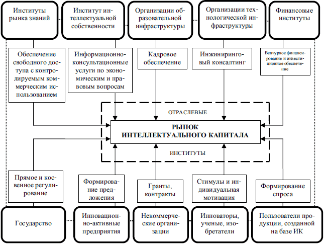 Велика роль государства в функционировании институциональной инфраструктуры рынка интеллектуального капитала. Оценивая современный уровень государственного регулирования в инновационной сфере, следует отметить, что Правительством РФ за последние годы был предпринят целый ряд действий, сопровождающихся отдельными мероприятиями по поддержке новых исследовательских направлений и перспективных технологий. Принята программа «Научные и научно-педагогические кадры инновационной России», которая рассчитана на 2009–2013 годы, учреждены специальные премии Президента в области науки и инноваций для молодых учёных. В частности утверждена программа развития наноиндустрии в России до 2015 года, созданы госкорпорации, сформулированы приоритеты технологического развития РФ.