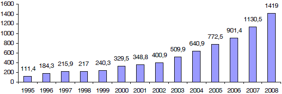 В 2008 году в создании и использовании объектов промышленной собственности было задействовано 186 предприятий и организаций Харьковской области. Количество предприятий, которые занимаются новаторской деятельностью, увеличилось на 5,7 % по сравнению с 2007 годом. С 1995 по 2008 годы объемы выполненных научных и научно-технических работ увеличились почти в 13 раз. Это отображено на рис. 3.5.